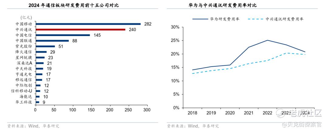 对比上市公司通信板块,公司研发费用明显领先于同行,2024 年国内通讯上市公司研发费用前十五的排名中,公司以 240 亿投入位列第二,仅次于通信板块龙头中国移动。与同样以高水平研发投入著称的**对比,2018-2024 年公司与**保持相近研发费用率。