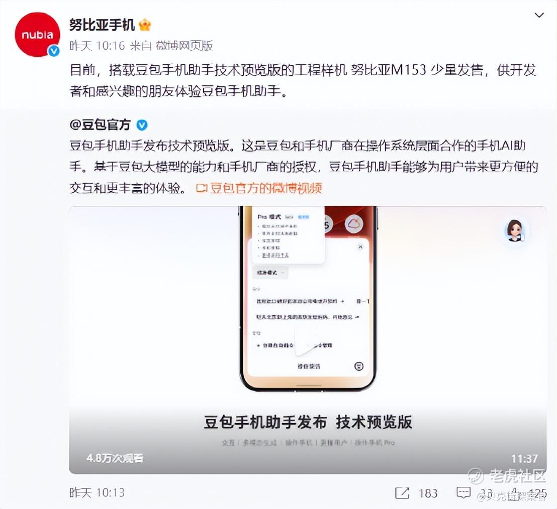 从行业层面看,手机作为核心载体,为大模型开拓最广阔的应用落地场景与商业变现之路。目前开发者和科技爱好者已经可以在豆包与中兴合作的工程样机nubia M153上,体验豆包手机助手的技术预览版本。目前该版本已面向开发者和科技爱好者少量发售,售价3499元。