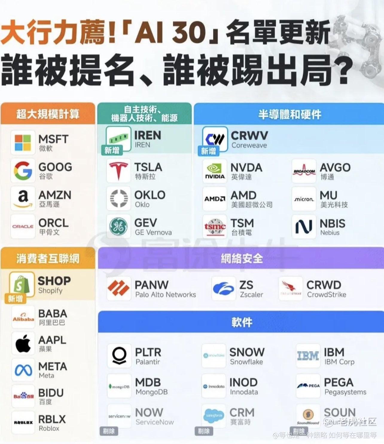 🚀📊大行AI 30 名单大更新:谁被提升、谁被踢出局?这张图其实透露了下一轮 AI 资本流向的方向盘($NVDA $TSLA)