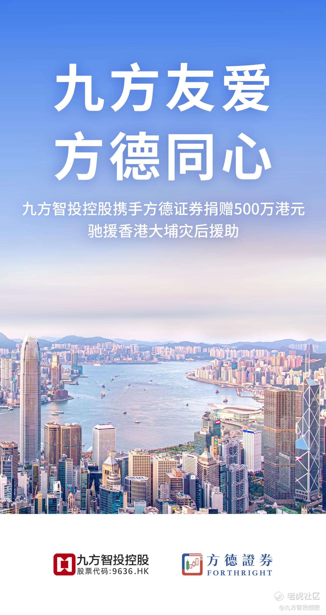 九方智投控股(9636.HK)作为在香港上市的金融科技企业情系香港同胞,第一时间联合香港本土互联网券商方德证券,通过上海九方公益基金会等公益组织,捐赠500万港元至大埔宏福苑援助基金,专项用于受灾居民的紧急安置、医疗救助与灾后重建等工作。