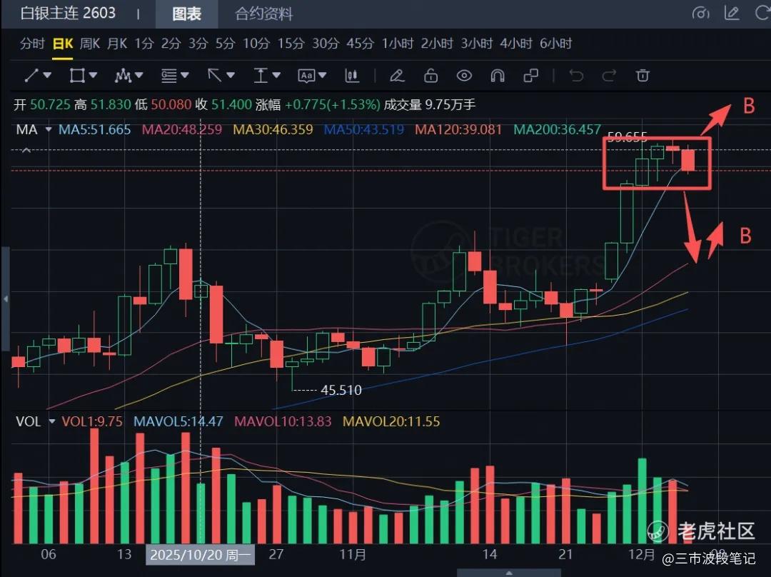 因此,如果用白银来举例,下一个B点,向上是强势突破小箱体,或者在均线处企稳之后拐头向上。中间的位置,就不要去考虑了,降仓应对就是。