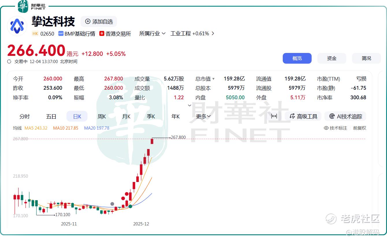 12月4日,充电桩赛道龙头 $挚达科技(02650)$ 股价再度攀升,截至发稿前,涨幅为5.05 %,报266.4港元/股。
