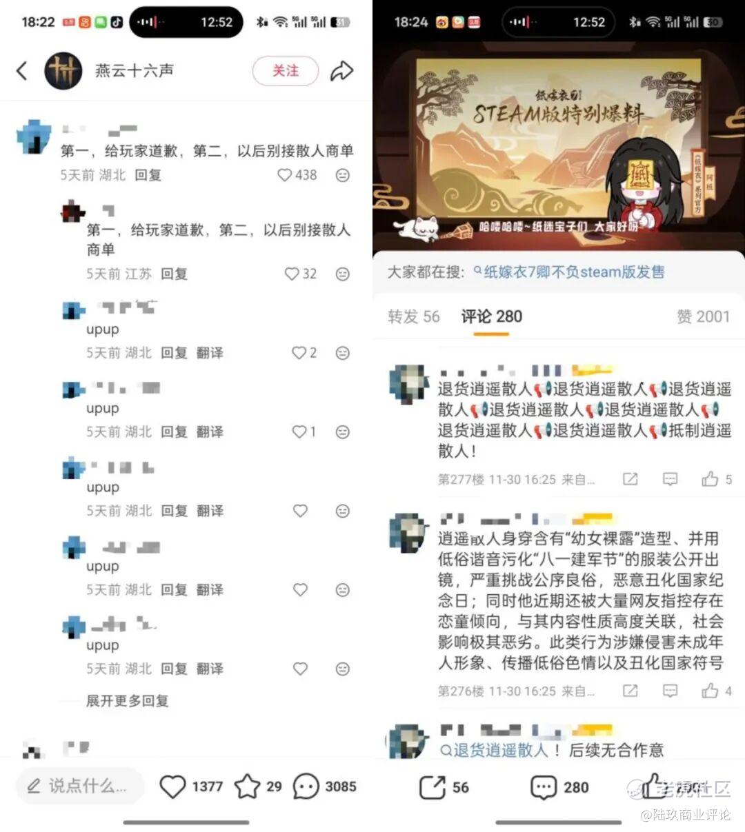 网易旗下多款游戏也遭到波及。由于逍遥散人与网易旗下多款游戏社群有交集,网易便成了下一个目标。手游《逆水寒》的官方社交账号成为了新的攻击目标,原本邀请逍遥散人参加活动,事发后只能对外宣布其“因个人行程原因”无法出席。随后,《燕云十六声》《纸嫁衣》等风格迥异、受众不同的游戏官方社交媒体账号也受到不同程度的舆论攻击。