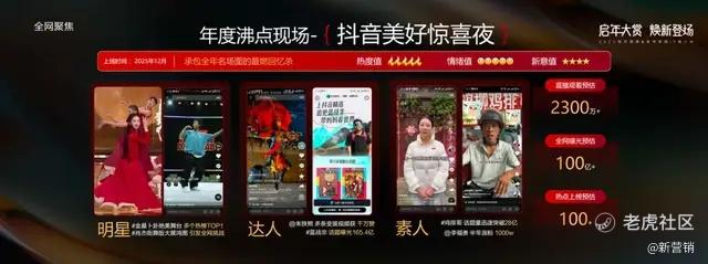 在跨年节点,跨年晚会和跨年演唱会是最受年轻人欢迎的仪式。「抖音美好惊喜夜」是抖音平台的跨年晚会,既有过去一年抖音上各种名场面、标志性人物集体回忆杀,又会制造大量新热点上榜,百亿级曝光,热度值和欢乐值拉满,情绪普适性高,非常适合品牌打开认知度、好感度。