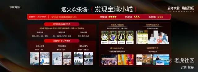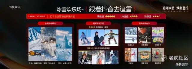 基于春节出游热点,抖音生活服务打造了「跟着抖音去追雪」「发现宝藏小城」等IP项目,前者与全国雪场以及哈尔滨冰雪大世界深度联动,展开线上内容和线下文旅全方位合作,为用户提供欢乐冰雪体验;后者则深入有特色的小城,譬如温泉小城、洗浴小城以及冰雪小城,带领用户走街串巷去寻找一些不踩雷的快乐。