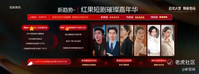 短剧爱好者有福了,新年之际将迎来「红果短剧璀璨嘉年华」,届时将举办首届红果短剧演员打榜盛典,通过20天的线上投票以及一场超长拉票直播借力,由观众票选出年度最受欢迎的短剧和演员,并举办盛大的颁奖典礼。与此同时,红果将推出全新的招商剧模式,品牌合作门槛更低、合作空间更大、内容玩法更多元,对于有志于短剧营销的品牌而言十分值得关注。
