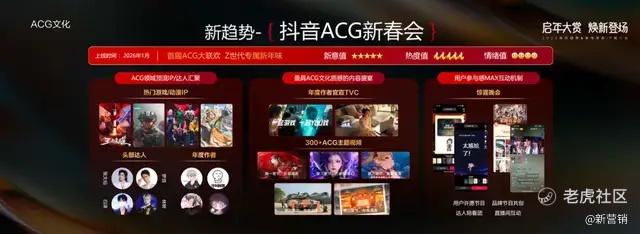 2026年抖音将举办首届ACG新春会大联欢,邀请王者荣耀、三角洲等顶流IP合作,众多头部达人加入,丰富的内容和互动参与机制将惊喜满满。众所周知二次元的消费力惊人,也是许多品牌重点关注的圈层人群,这样一场属于二次元自己的春晚也将是品牌攻略二次元人群的好机会。