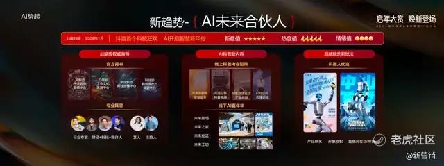 科技硬核爱好者也有自己的“春晚”,抖音将举办首次「AI未来合伙人」活动,邀请官方机构、媒体以及专家达人共同进行AI相关知识科普,通过线上科普内容和线下AI嘉年华结合,打造一场科技盛典。结合IP项目,平台将推出机器人代言新玩法,通过产品联名、形象授权、进入直播间互动等形式,让 AI赋能营销。