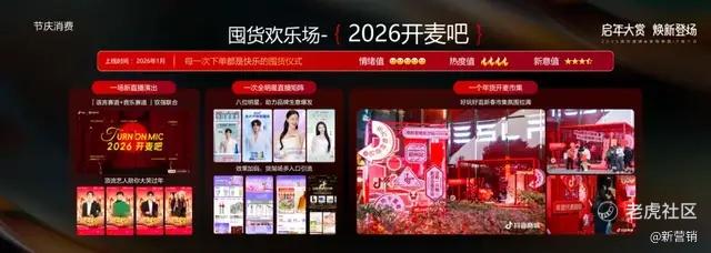 针对年轻人的喜好,抖音将在春节期间推出多个既有好东西、好价格又有欢乐好体验的IP项目,满足用户边玩边买的诉求。例如,抖音电商年货节将推出「2026开麦吧」IP,邀请喜剧界、音乐界的顶流艺人一起陪大家大笑过年,并且会进入品牌直播间陪大家一起挑选年货,让每一次下单都是快乐的囤货仪式。此外,抖音本地生活服务将推出「新春吃喝玩乐节」,邀请100个以上的明星达人一起走出家门展开一场全国范围的吃喝玩乐狂欢,抖音将在全国50多个重点城市设立线下欢乐场,和各地庙会结合起来提供热闹年味和丰富体验,将为本地商家带来巨大流量机会。