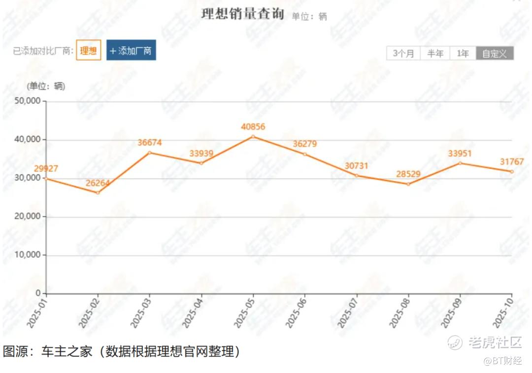 理想公布的2025年10月销量显示,10月销量为3.18万辆,同比下降38.25%。前10个月交付32.89万辆,同比下降16.36%。理想此前为2025年定下的年度销量目标是70万辆,但后来将销量目标下调至64万辆。即便是年度销量目标下调至64万辆,前10个月的总销量为32.89万辆,完成目标任务的51.39%。在全年仅剩不到2个月的情况下,想要完成31.11万辆的销量,平均每月要卖出15.6万辆,前10个月中销量最高的5月也只有40856辆,其他9个月的销量均在4万辆以下,其中还有3个月销量低于3万辆,想要单月销量15.6万辆面临挑战。