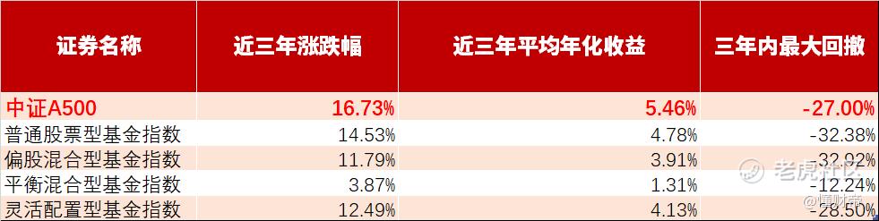 从近三年的年化收益、回撤幅度上综合比较,中证A500指数的表现优于四类主动权益基金指数。