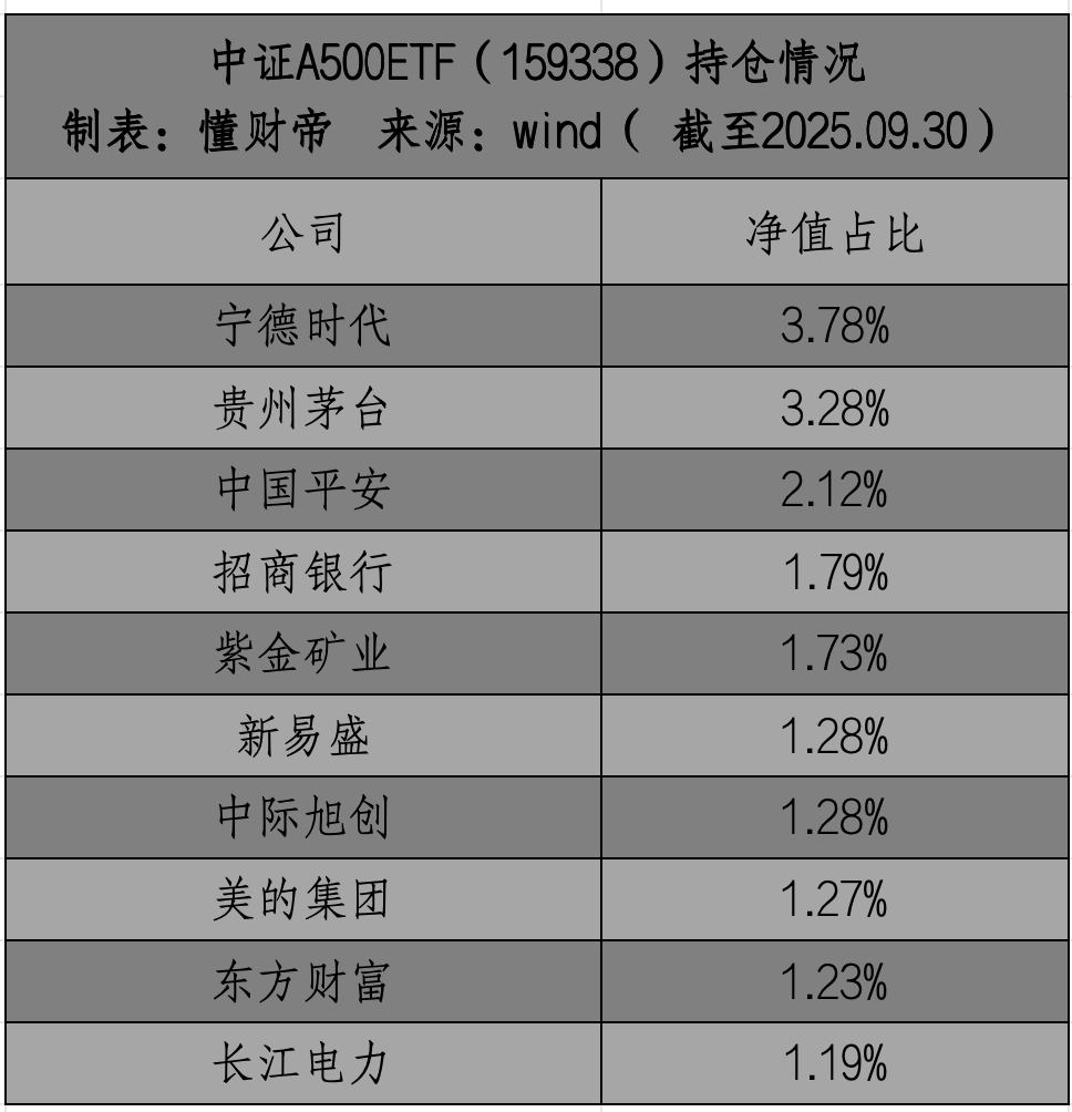 中证A500ETF(159338)紧密结合市场趋势,持仓包含前两年备受关注的新能源龙头企业,传统核心资产的老牌代表,也包含今年行情火热的“易中天”中的两家企业。