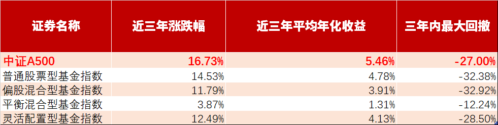 从近三年的年化收益、回撤幅度上综合比较,中证A500指数的表现优于四类主动权益基金指数。