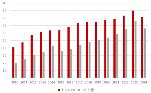 自 2010年至 2024年的15个财务年度,中证 A500 指数成分股年度现金分红公司数量占比高于中证全指,截至 2025 年 4 月 10 日,2024 年中证 A500 中已有 148 家在 2024 年实现现金分红,占比 29.60%,显著高于中证全指数的 18.08%。