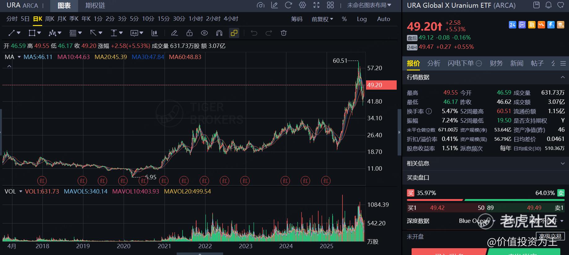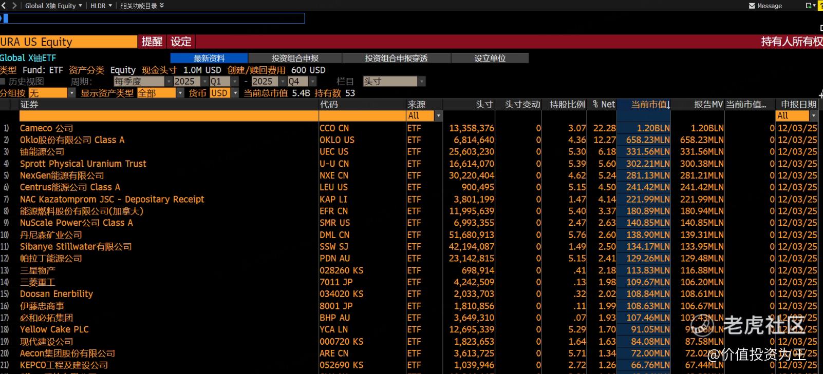 目前,市场上有关核电的ETF主要有9个,其中,规模最大的是Global X铀ETF(代码:URA): $Global X Uranium ETF(URA)$