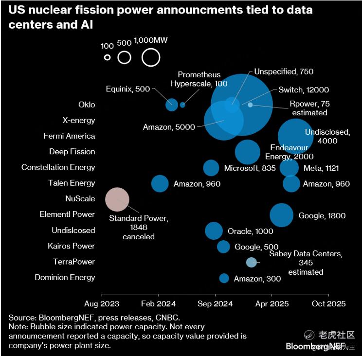 据彭博新能源财经统计,美国数据中心产商与核电企业签署了超过32GW的裂变反应堆产能合作: