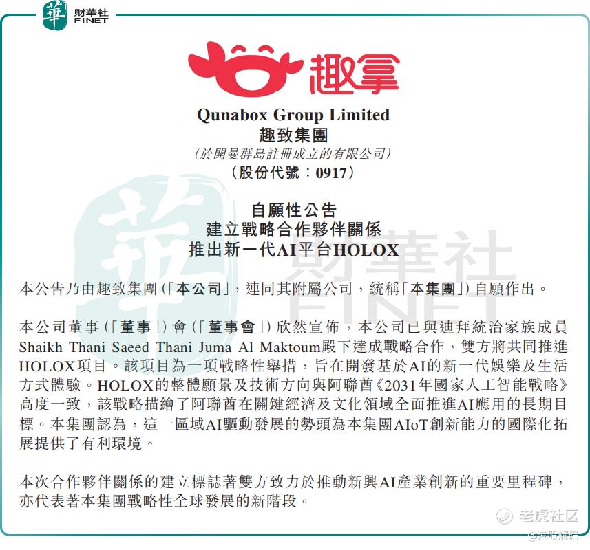 趣致集团称,本次合作伙伴关系的建立,标志着双方致力于推动新兴AI产业创新的重要里程碑,亦代表着集团战略性全球发展的新阶段。