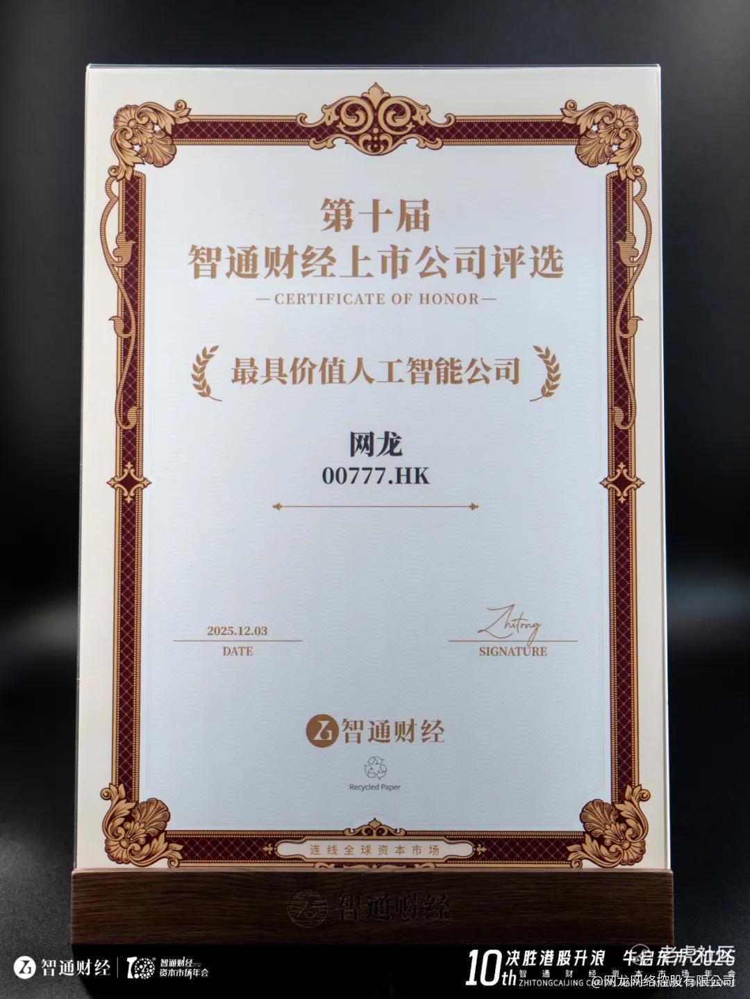 2025年12月3日,在深圳举办的“第十届智通财经上市公司颁奖盛典”上,网龙凭借其在人工智能(AI)领域展现出的全面领先实力与高成长性,荣获 “最具价值人工智能公司”奖,获得业界高度肯定。