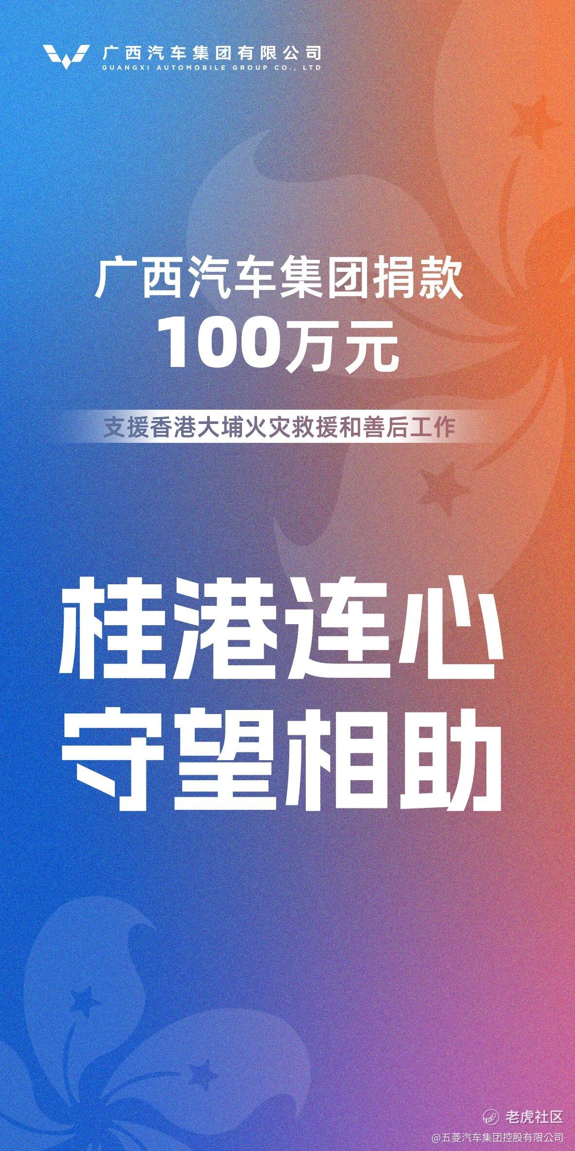 11月26日,香港新界大埔宏福苑发生严重火灾,造成重大人员伤亡和财产损失,灾情牵动人心。五菱汽车母公司广西汽车集团与香港各界一直保持着密切的经济合作与情感联结,面对这场突如其来的灾难,集团捐款总计100万元人民币,全力支援香港火灾救援与灾后重建工作,以实际行动践行国企社会责任。