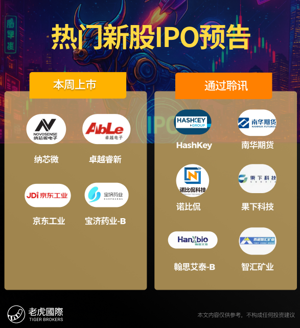 招股端,京东工业、宝济药业-B、纳芯微、卓越睿新同样4家上阵,纳芯微、卓越睿新、宝济药业-B三家已完成招股,纳芯微暗盘收跌9.22%,卓越睿新暗盘收涨30.5%,两家将于12月8日正式挂牌上市,宝济药业-B则将于12月10日挂牌上市,京东工业预计于2025年12月11日在港交所挂牌上市。