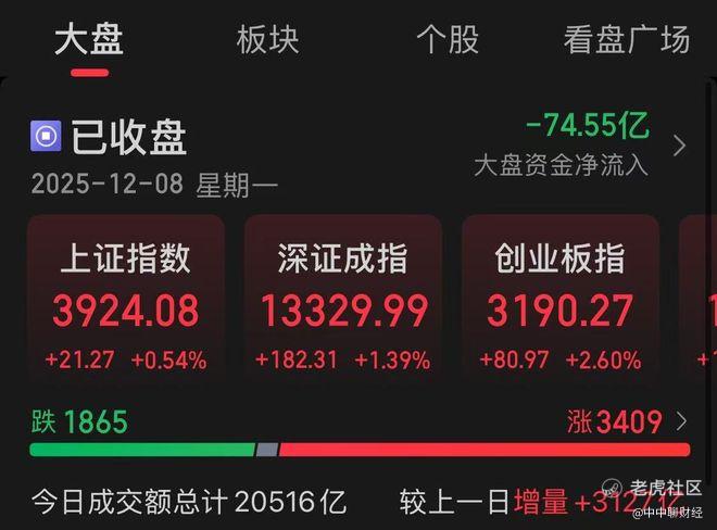 $上证指数(000001.SH)$ 12月8日,A股市场迎来放量大涨,三大指数全线飘红,创业板指领涨,涨幅高达2.60%,明显有增量资金入场,但我却熬不住了,说实话,4000点上下的行情是真难熬,我犹犹豫豫的进一步减仓,仅剩四分之一仓位,当前,手里有充足的子弹,这样的话即便变盘向下,也能从从容容应对。