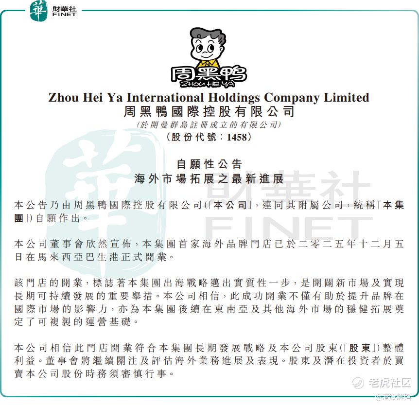 周黑鸭称,公司相信此成功开业不仅有助于提升品牌在国际市场的影响力,亦为公司后续在东南亚及其他海外市场的稳健拓展,奠定了可复制的运营基础。
