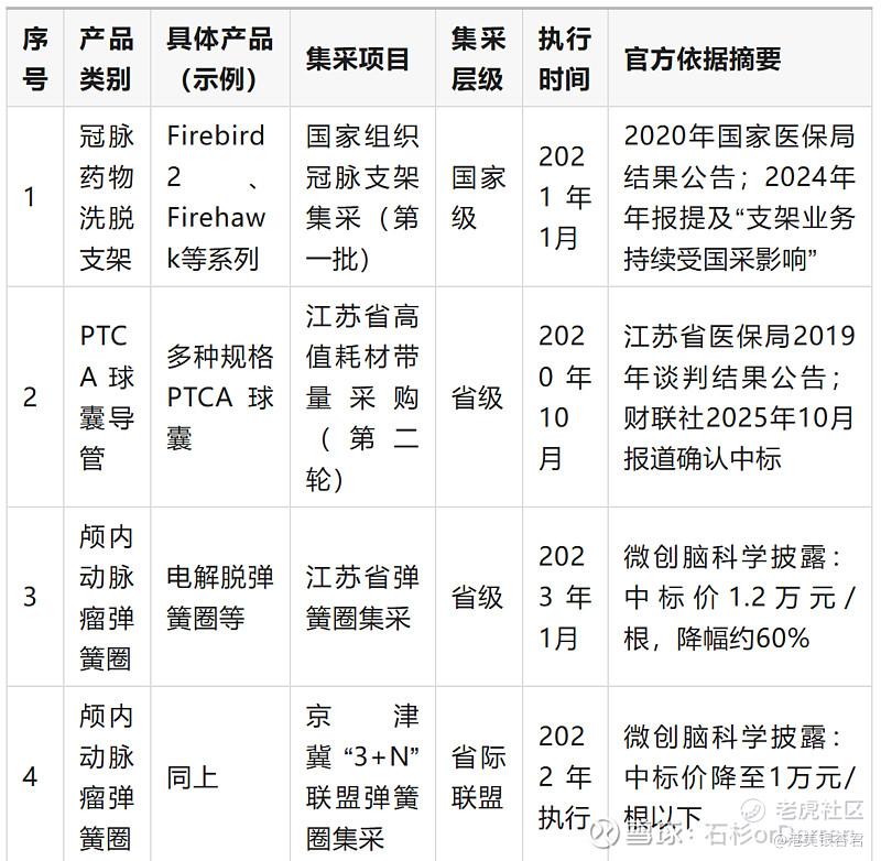 截至今天(2025年11月7日),微创医疗旗下明确进入国家或省级集中带量采购范围的产品已覆盖四大业务板块,具体如下表所示: