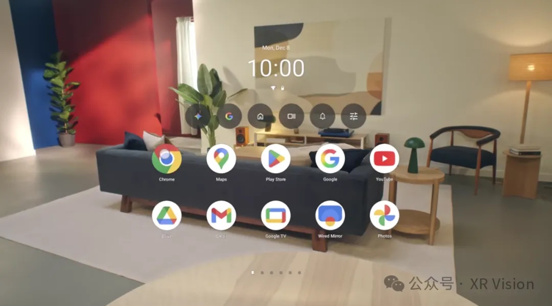 这次Google发布的重点在于Project Aura实现的系统效果展示上,可以看出来体验上和Galaxy XR基本一样,主界面里包含了非常丰富的Google原生应用,有Chrome、Maps、Play Store、Google、YouTube、Photo、Gmail、Google Cloud等Google全家桶。支持Play Store,也代表着Google的大部分安卓应用,只要交互方式支持,都可以运行在Project Aura上。