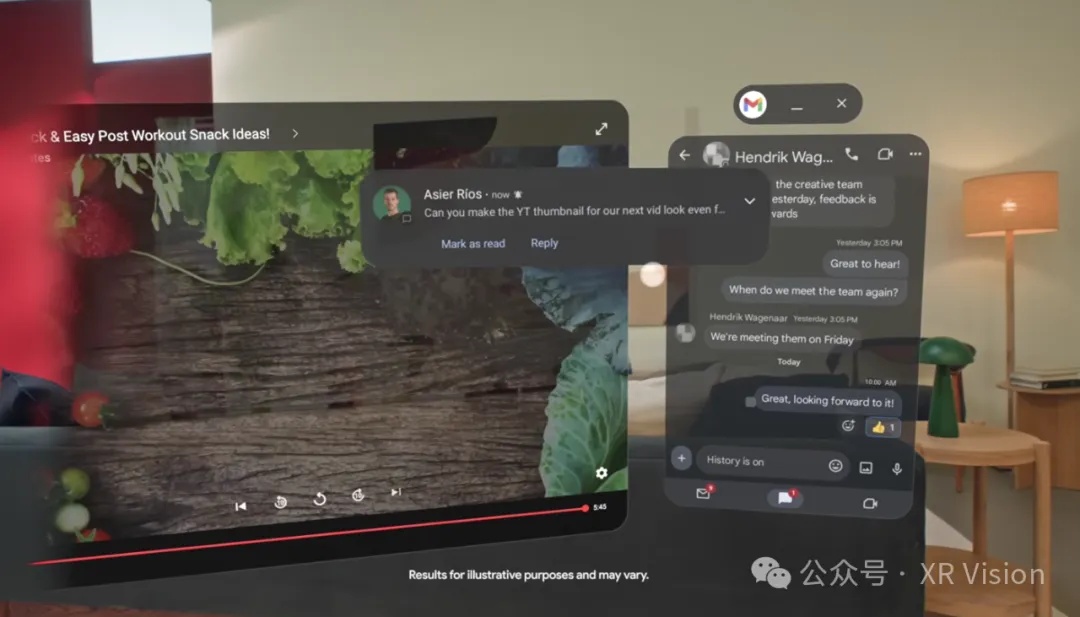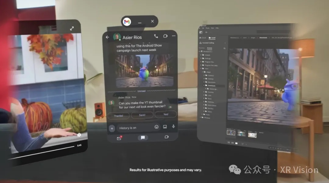 从演示视频来看,Project Aura可以实现多应用窗口显示,这样用户可以一边看视频,一边聊天或者查看邮件。在应用显示窗口与视场角边缘交界的位置,还会有过渡的效果,细节感满满。不得不说Google这样大厂出品,交互体验上还是非常有保障的。