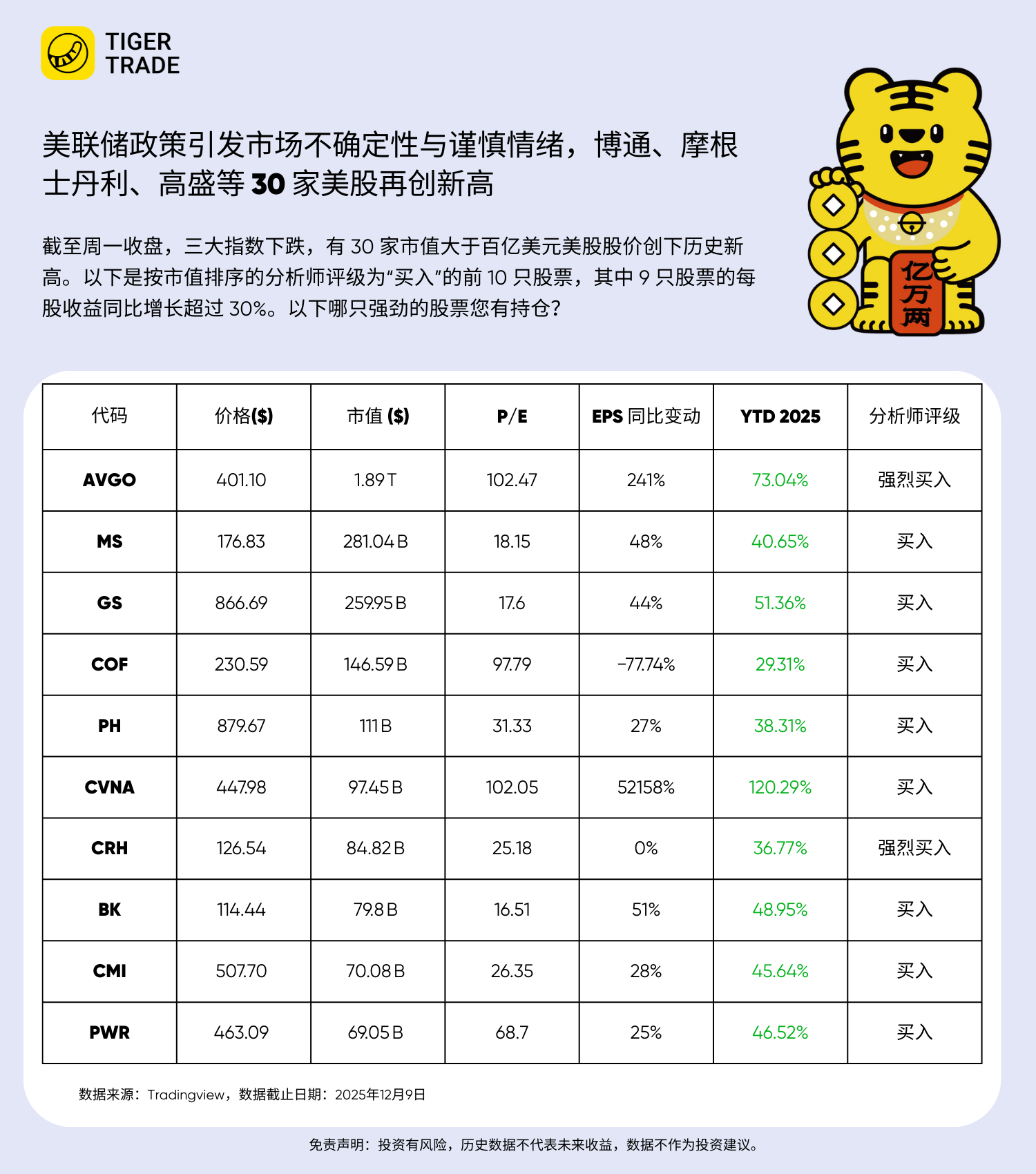 截止2025年12月8日,跨越各个行业的这十家公司创下了历史最高股价,报告了由AI、技术、金融和工业发展驱动的强劲增长。 $博通(AVGO)$ 实现了22%的收入增长,得益于AI半导体; $摩根士丹利(MS)$ 和 $高盛(GS)$ 在交易和投资银行手续费的推动下公布了强劲的业绩。 $礼来(LLY)$ 的收入激增54%, $强生(JNJ)$ 的收入增长12%,在制药领域表现卓越。 $汉尼汾(PH)$ 的净收入增长了32%, $Carvana Co.(CVNA)$ 的收入激增42%。 $CRH水泥(CRH)$ 上调了其EBITDA预期,$Bank of New York Mellon和 $康明斯(CMI)$ 报告了强劲的收入增长。 $Quanta, Inc.(QNTA)$ 的创纪录订单积压和自由现金流凸显了其尽管在大型项目中存在更高执行风险,仍然表现稳健。这些结果反映了AI、医疗保健、金融和基础设施等行业的广泛增长。