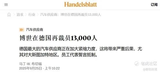 一边是其燃油车中阶智驾方案斩获东风、北汽等五家车企十余款车型定点,成为油车智能化的破局者;另一边是德国Feuerbach工厂外,数千员工举着十字架抗议裁员——今年9月官宣在德移动出行部门削减1.3万个岗位,叠加去年已裁的9000个岗位,累计裁员超2.2万个,创下其138年发展史上的裁员纪录。