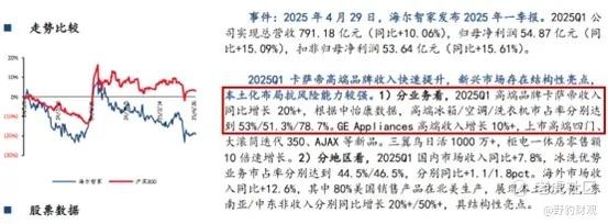 据太平洋证券研报数据,2025年一季度卡萨帝品牌收入同比增长超20%,其高端冰箱、空调、洗衣机市占率分别达到53%、51.3%、78.7%,连续9年坐稳高端家电头把交椅。