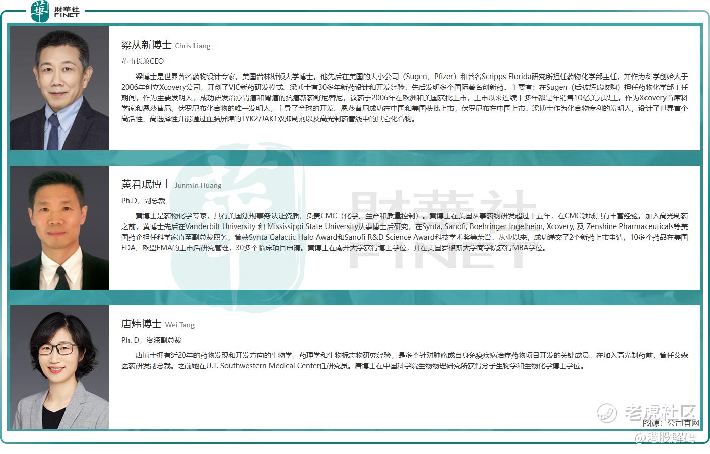 公司副总裁黄君珉博士(高级管理层)与资深副总裁唐炜博士同样实力雄厚。前者是药物化学专家,在CMC领域经验丰富;后者则在药物发现和开发的生物学、药理学及生物标志物研究领域有着深厚积累。