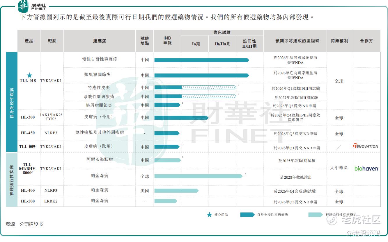 根据招股书,公司已构建覆盖多种自身免疫性疾病及神经退行性疾病适应症的差异化产品管线,包括四款临床阶段候选药物(即核心产品TLL-018、HL-300、TLL-041及HL-400)以及三款选定临床前候选药物(包括HL-450、TLL-009及HL-500)。