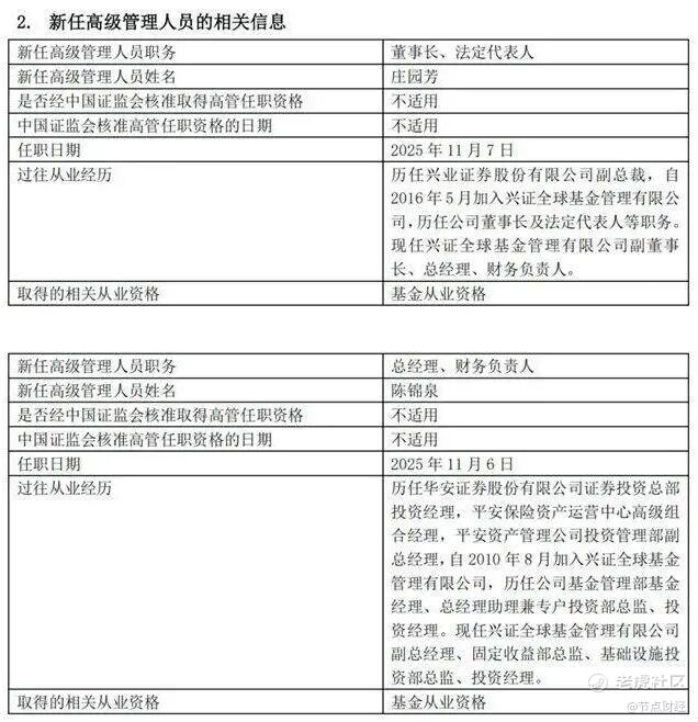11月7日,兴证全球基金发布公告称,公司原总经理庄园芳升任董事长,公司原副总经理陈锦泉自11月6日起担任总经理、财务负责人。