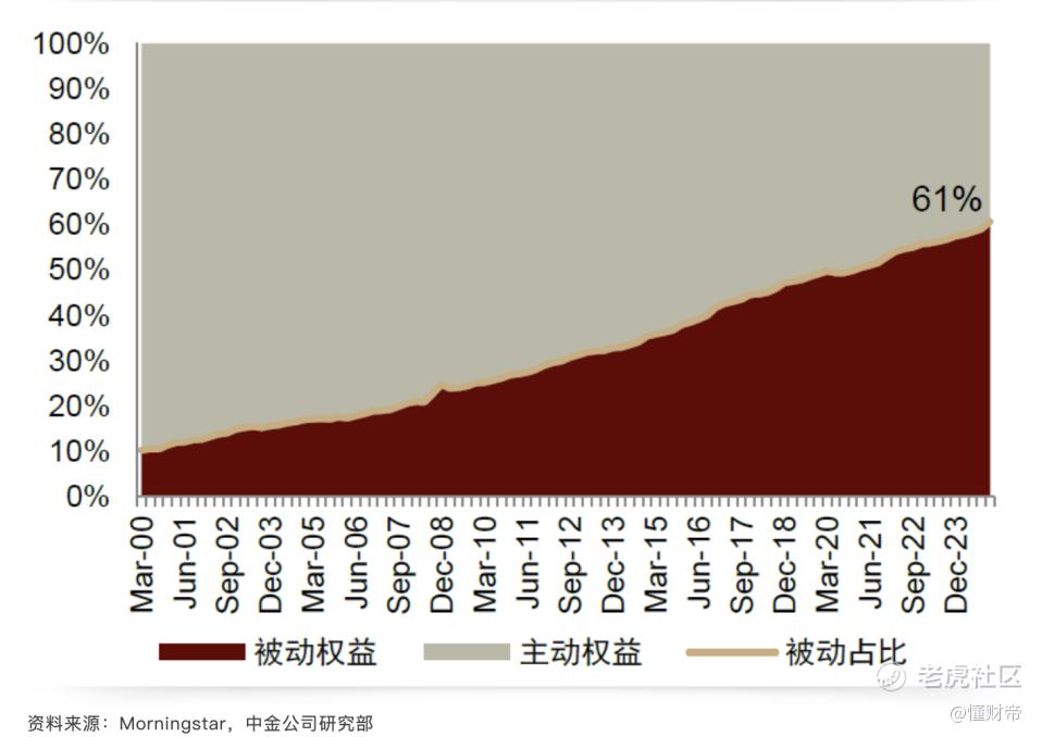 美国,全球最成熟的资本市场,亦是如此。过去20多年,被动权益占比不断提升,到2024年末已超过60%。