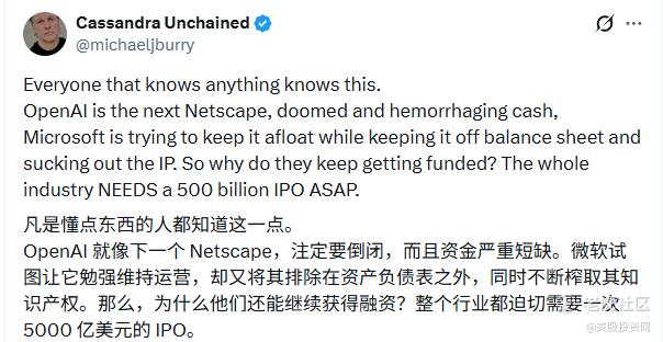 伯里将AI巨头 OpenAI 比作 “下一个网景(Netscape)”,称其“注定失败且正在疯狂烧钱” 。