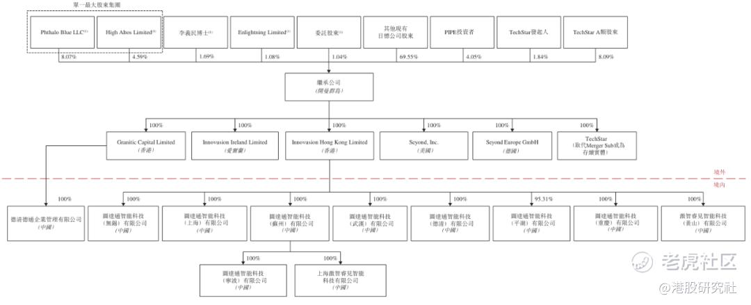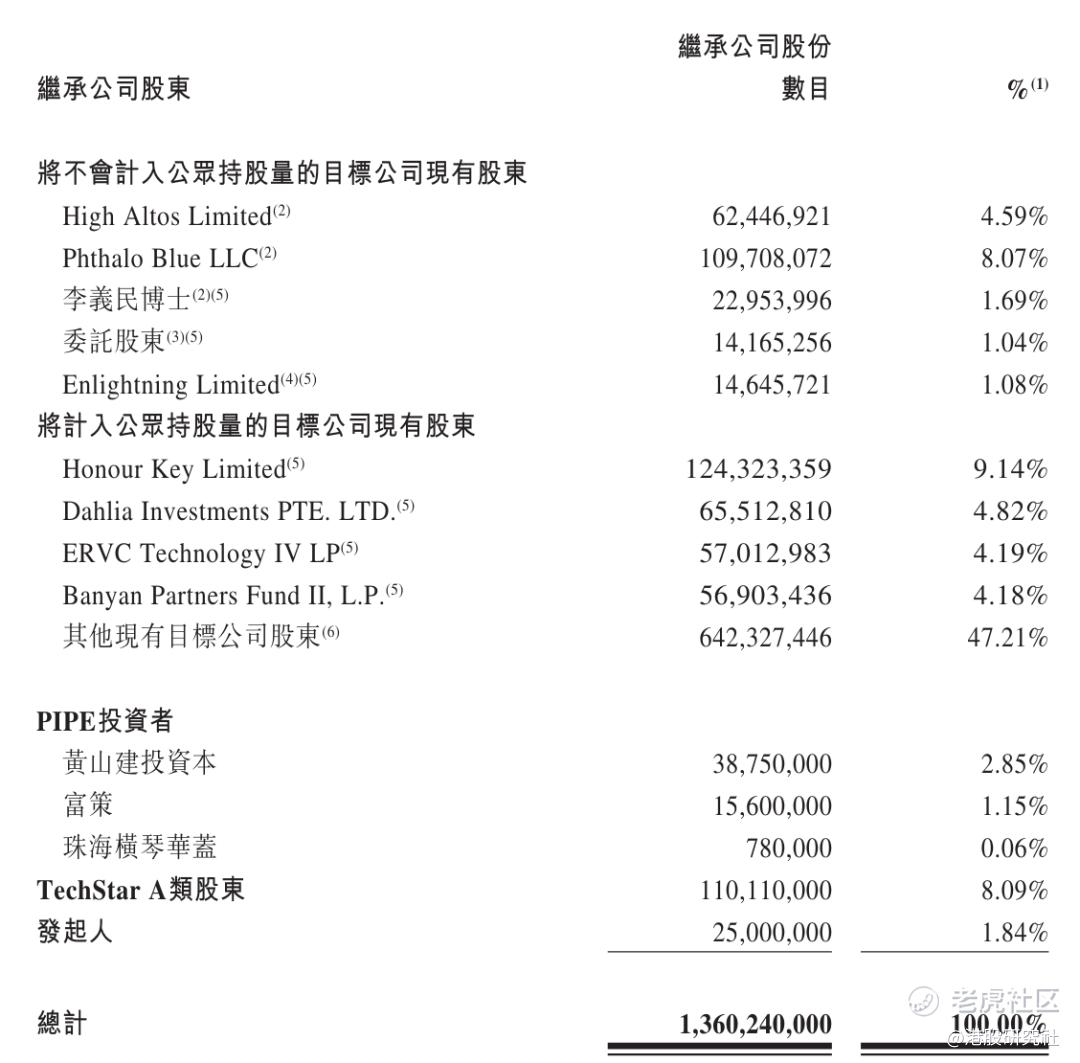 其中,鲍君威通过旗下HighAltos Limited控制公司4.59%的投票权;通过Phthalo Blue LLC控制8.07%的投票权,李义民持股为1.69%,TechStar发起人持股为1.84%,TechStar现有股东持股为8.09%。PIPE投资者共持股4.06%,其中,黄山建投资本持股2.85%,富策持股为1.15%。