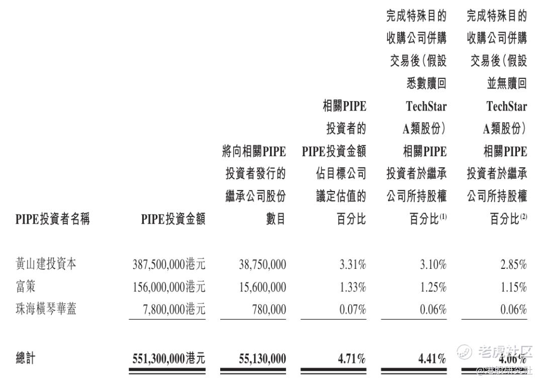 根据PIPE投资协议来自PIPE投资的所得款项总额约为5.51亿港元,其中,黄山建投资本认购3.88亿港元,富策认购1.56亿港元,珠海横琴华盖认购780万港元。图达通的股本价值约135.7亿港元。