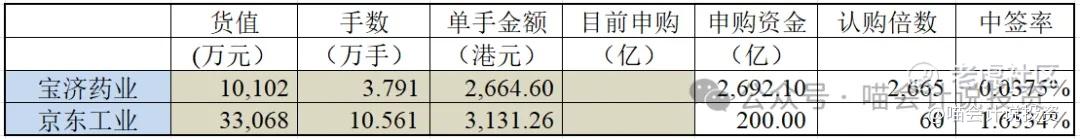 由此可以推导出申购京东工业的总资金量仅为200亿规模,认购倍数约为60倍;