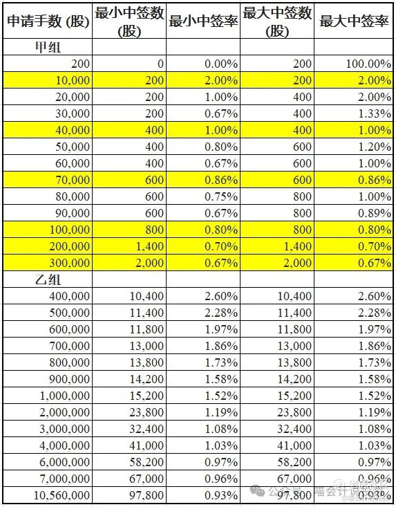 甲组单手中签率从头部的2%逐阶递减到甲尾的0.67%;