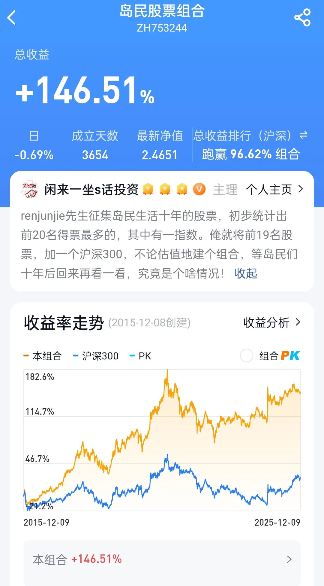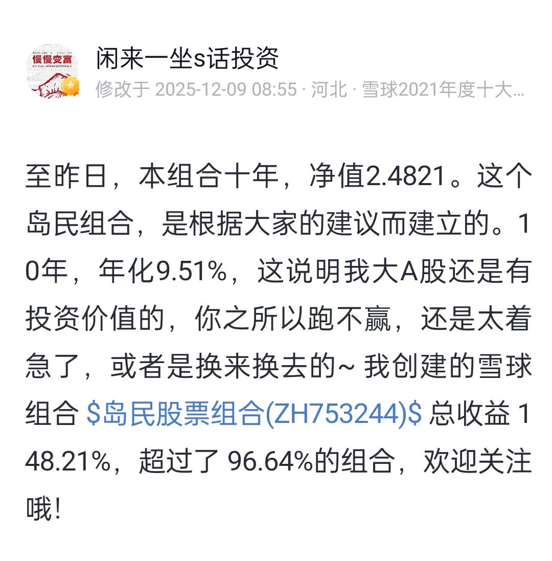 雪球闲来一坐s话投资在2015年12月8日建立了岛民股票组合,至2025年12月8日整整十年了。