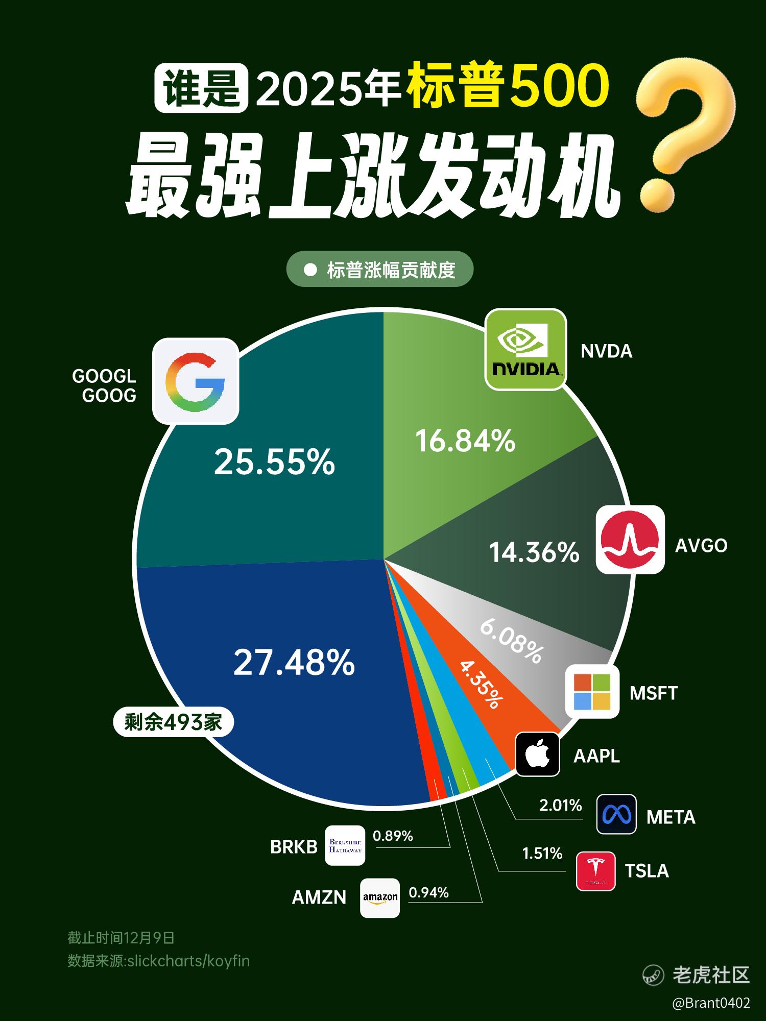 AI三巨头撑起半壁江山: $英伟达(NVDA)$ 、 $谷歌A(GOOGL)$ $谷歌(GOOG)$ 、 $博通(AVGO)$ 是这一年的绝对发动机,托起了标普的大半涨幅。