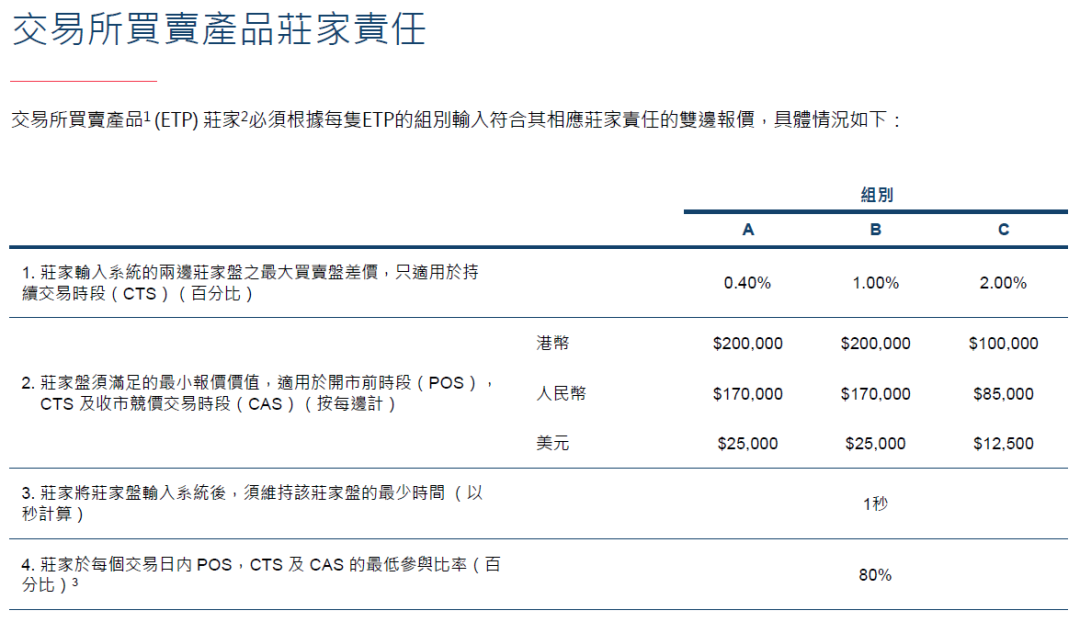 港交所对ETP庄家报价买卖价差上限、最低报价金额和最低参与比率等均有规定