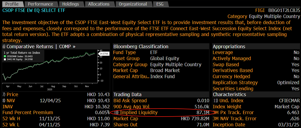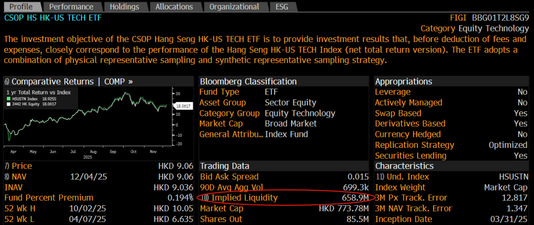 南方东英富时东西股票精选ETF(3441.HK)自上市以来日均成交额为678万港币,但这只是表面流动性,彭博上可以看到潜在流动性(Implied Liquidity)达87.1百万个单位(或9亿港元)。而南方东英恒生港美科技ETF(3442.HK)的潜在流动性达658.9百万个单位(或60亿港元),远高于上市以来的日均成交额183万港币,这些都意味着在不构成市场买压或卖压的情况下,这两只ETF的成交潜力,远超大家盘面看到的交易量。