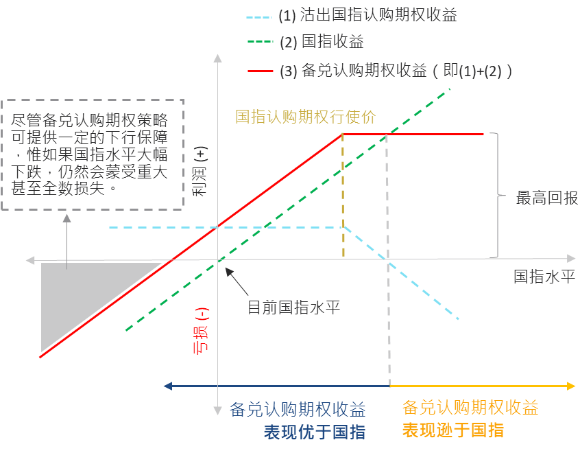 本文件所述产品采用备兑认购期权策略,当中涉及沽出参考指数的认购期权。备兑认购期权策略虽能提供一定程度的下行保障,但潜在升幅亦受限制。该产品将会买入国指股票、国指期货及国指ETF的相关长仓,而作为以相关长仓进行备兑的国指认购期权的卖方,该产品将会继续承担参考指数市值下跌的风险。
