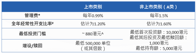 资料来源:南方东英。 *务请注意,某些费用可藉向单位持有人发出一个月的事先通知而增加至允许上限的金额。详情请参阅章程第一部分“费用及收费”一节。# 由于该基金乃新成立,该数据仅属最佳估计数字,代表于 12 个月期间的估计经常性开支总和,以占同期估计平均资产净值的百分比列示。于该基金实际运作时,该数据可能有差别,且每年均可能有所变动。在该基金推出后首 12 个月内,经常性开支比率数字以该基金平均资产净值的 2%为上限,而任何超过该基金平均资产净值 2%的经常性开支将由基金经理承担,不会从该基金中扣除。^ 仅供参考,上市份额初次发售期间的发行价为每单位8.8港元。
