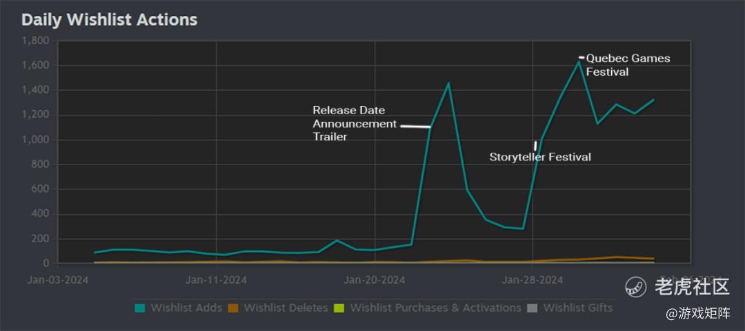 试玩版于2023年11月发布(如上图红色箭头所示),并一直持续到正式发售。在此期间,他们参加了所有能参加的游戏节,包括Storyteller Festival、魁北克游戏节和Game Devs of Color。