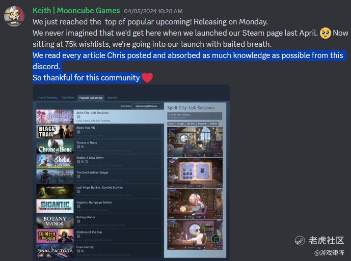 面对这些问题,学习成功者的经验无疑很有参考性。海外有从业者博客分享了同类游戏Spirit City:Lofi Sessions(幻灵之城)的成功经验,或许可以作为参考。