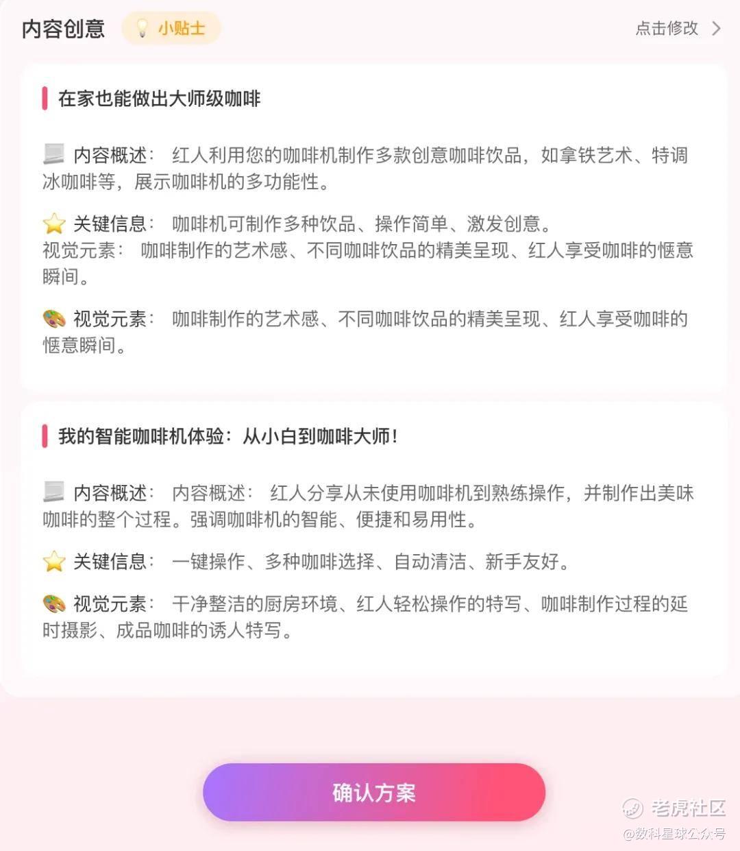第二,在筛选出建联达人名单后,AI小兔同时会生成内容创意方向。包含内容主题、卖点、思路及视觉因素,如“开箱测评+场景化使用”“竞品对比+核心功能拆解”,甚至对拍摄镜头及环境进行指导,“ 干净整洁的厨房环境、红人轻松操作的特写、咖啡制作过程的延时摄影、成品咖啡的诱人特写”,以此提升视频曝光。